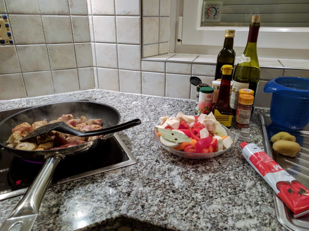 - Fleisch im Oel auf hoher Stufe anbraten, herausnehmen und würzen.