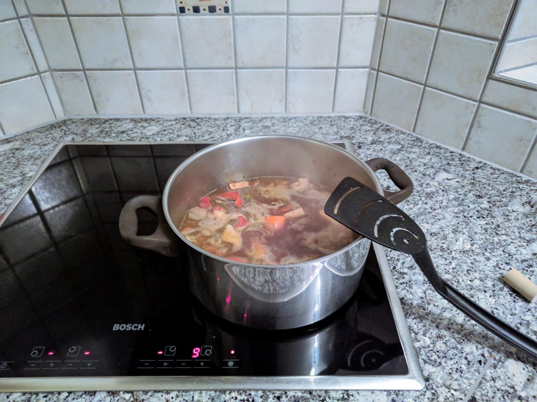 - Bei kleiner Hitze zugedeckt ca 2 Std. köcheln lassen. Ab und zu umrühren.